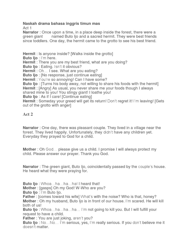 Pada suatu waktu di tempat yang jauh di dalam hutan ada raksasa hijau bernama Buto Ijo dan pertapa suci. Scene 1 Long time ago In Daha Kingdom lived two beautiful girls named Dewi Kirana dan Dewi Galuh zaman dahulu. Contoh naskah drama timun mas dalam bahasa inggris act 1 narrator.